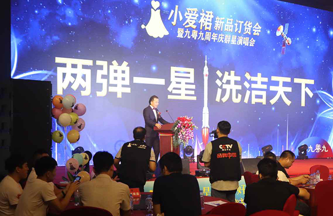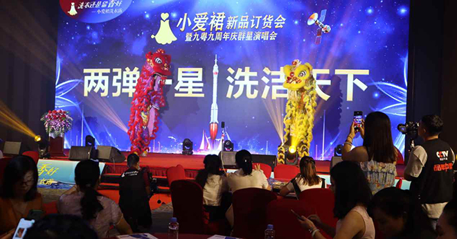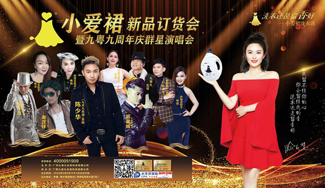 2020年9月9日,小爱裙品牌订货会暨九粤九周年庆群星演唱会,在南宁荔园饭店拉开帷幕,整个活动共分为两大部分,既是小爱裙品牌洗衣露隆重上市的新品订货会,也是九粤九公司的两周年庆典群星演唱会,整场活动盛况空前,并有《品牌中国》栏目组全程跟踪拍摄,30多家网络媒体进行同步直播,在现场三百多位行业大咖,以及场外观看直播的160多万观众的共同见证下,小爱裙洗衣露品牌一夜爆红,成为行内及行外人士茶余饭后谈论的焦点。这一条小爱裙到底有何魅力,让我们通过这场盛会来一探究竟。