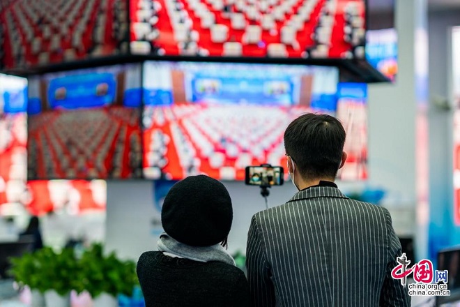 11月4日,第三届中国国际进口博览会开幕式在上海举行,中外媒体在新闻中心内观看开幕式。中国网记者 郑亮摄