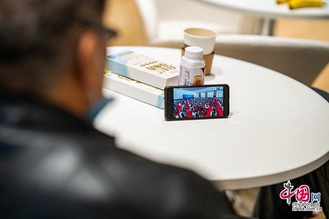11月4日,第三届中国国际进口博览会开幕式在上海举行,在新闻中心内媒体记者通过手机观看开幕式。中国网记者 郑亮摄