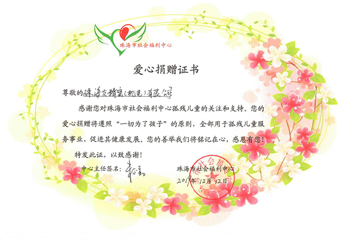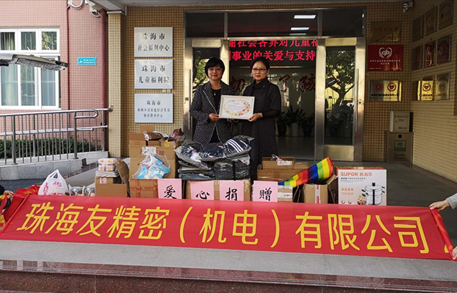 珠海友精密(机电)有限公司还会经常到福利院进行进行“献爱心”活动。这些活动,友精密用满益的爱心,诠释了“奉献、关爱、回馈"。用实际行动阐述了一个良心企业应该有的作为,也深深的感受到了企业身上所肩负的社会责任重大,并要把这样的爱心长期坚持下去,将爱心星火相传。