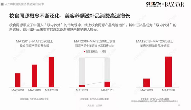根据CBNData联合时尚芭莎发布的《2020中国美颜消费趋势白皮书》的数据显示,线上妆食同源产品消费近年来呈高速增长态势,其中美容滋补品消费占比大幅攀升,成为现代人“以内养外”的新选择。