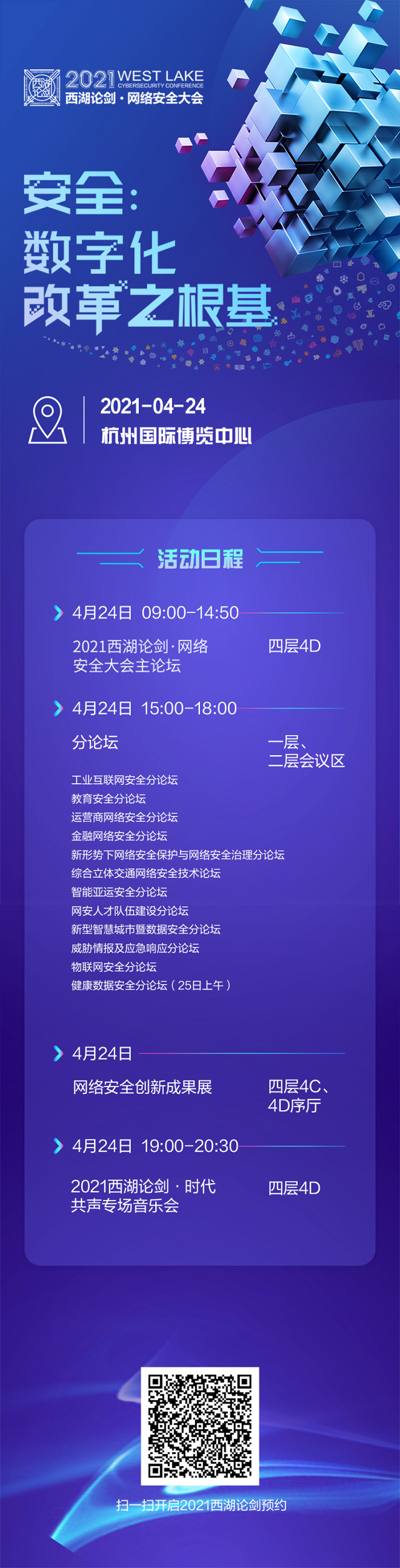 2021西湖论剑·网络安全大会在数字化改革的背景下顺势而为,就网络安全领域的种种问题,邀请多位院士及行业专家深入探讨。大会将设立一个主论坛、十二个分论坛和一场网络安全展览,其中涉及社会民生、行业经济和国内国际多个安全领域的热门话题,旨在为数字化改革奠定安全根基。