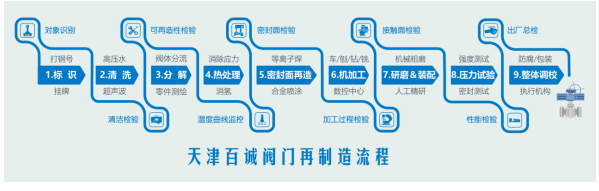 再制造简称再造,源于20世纪30年代的美国,进入21世纪中国开始推广。国外再造产业经过100年左右发展,已形成较为成熟的市场环境和运作模式,在设备生产工艺、技术标准、销售和售后服务等方面建立了较完善的再造体系。中国的再造相比欧美起步虽晚,但发展势头良好并独具特色,已成为世界上最重要的再造中心之一。天津百诚阀门公司就是中国再造事业崛起的众多推动者之一。