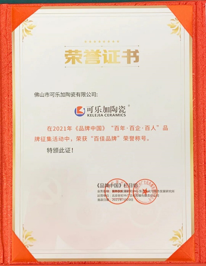 2021年7月20日,由《品牌中国》栏目、“CCTV民族品牌·荟萃闪耀”专案举办《品牌中国》”奋斗百年路·启航新征程--传承红色火炬,点亮中国品牌活动在北京市海淀区梅地亚中心隆重举行!国内优秀企业家、品牌负责人、领袖精英等齐聚一堂。【可乐加陶瓷】受邀出席并参与了本次表彰盛典。