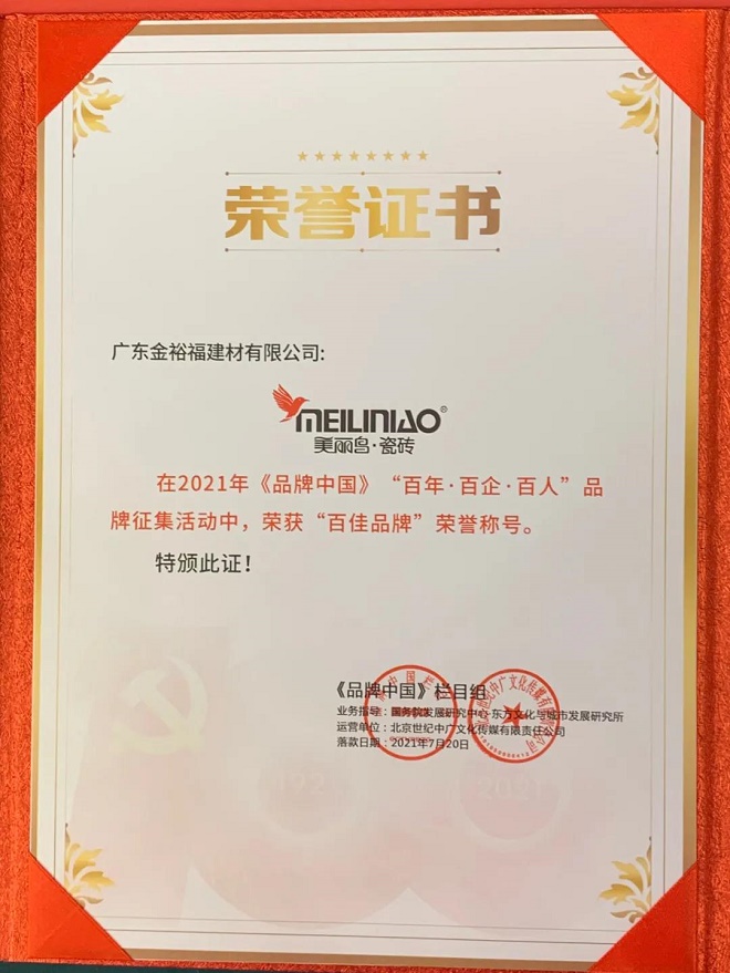 2021年7月20日,由《品牌中国》栏目、“CCTV民族品牌·荟萃闪耀”专案举办《品牌中国》”奋斗百年路·启航新征程--传承红色火炬,点亮中国品牌活动在北京市海淀区梅地亚中心隆重举行!国内优秀企业家、品牌负责人、领袖精英等齐聚一堂。【美丽鸟瓷砖】受邀出席并参与了本次表彰盛典。