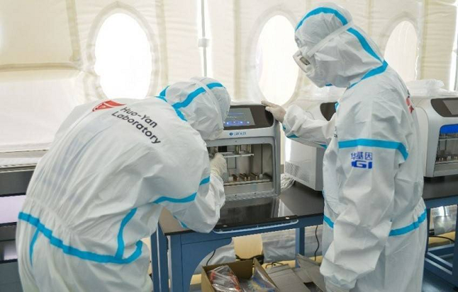 图:华大基因实验人员正在进行试剂检测工作