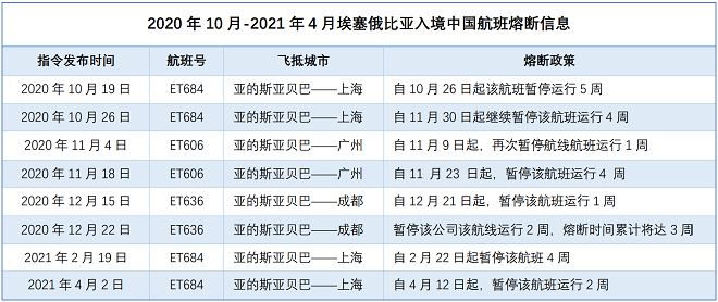 根据我国民航局官方信息显示,因入境航班乘客呈新冠阳性人数超出标准,自2020年10月至2021年4月2日,民航局先后8次对埃塞俄比亚航空港公司航班发出熔断指令。