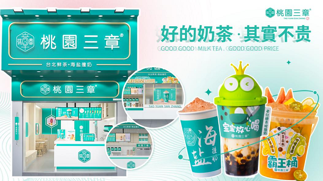 桃園三章,起源于台北桃园,被誉为“台饮新造”。是大满贯系列创始者,主打海盐撞奶及绿宝石柠檬茶。 从创立起,便秉持着“两高一低”-高速度、高品质、低价格的理念,保留经典的同时合理创新,为消费者提供好喝又不贵的奶茶。