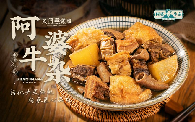 阿婆牛杂,1989年由陈桂珍老婆婆始创于广州,匠心制作牛杂,32年认真沉淀的老字号品牌,获非物质文化遗产称号。阿婆牛杂早已成为远近闻名的街头小吃,成为老广州人集体回忆,割舍不去的情怀。经过传承人杨子亮(阿亮)将牛杂制作工艺标准化,通过中央厨房加工制作,冷链配送,在门店可100%还原牛杂口感,使阿婆牛杂具备了供应链输出及门店产品复制能力。2020年,阿婆牛杂(广州)餐饮管理有限公司通过重塑阿婆牛杂品牌,定位年轻化市场,将商品从牛杂小吃延伸到牛杂粉面饭等快餐食品,并通过加盟模式,快速建立阿婆牛杂餐饮渠道,向加盟商销售统一制成的牛杂半成品,将传统的餐饮小吃生意,升级为连锁餐饮+供应链商业模式。
