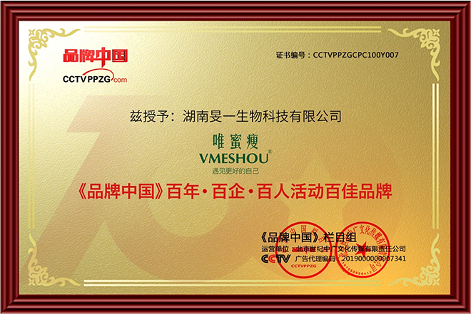 2021年7月20日,由《品牌中国》、CCTV《民族品牌·荟萃闪耀》专案主办的“奋斗百年路·启航新征程——传承红色火炬·点亮中国品牌”活动在北京市中央广播电视总台梅地亚中心举行。国家发改委城市中心、中共中央党史和文献研究院第三研究部、中央广播电视总台新闻中心等单位领导出席了本次活动。湖南旻一生物科技有限公司(以下简称:湖南旻一)旗下具有自主知识产权的健康塑形优质品牌VMESHOU(唯蜜瘦)获选“百佳品牌”荣誉称号,公司董事长李博之先生受邀出席此次活动并领奖。