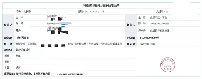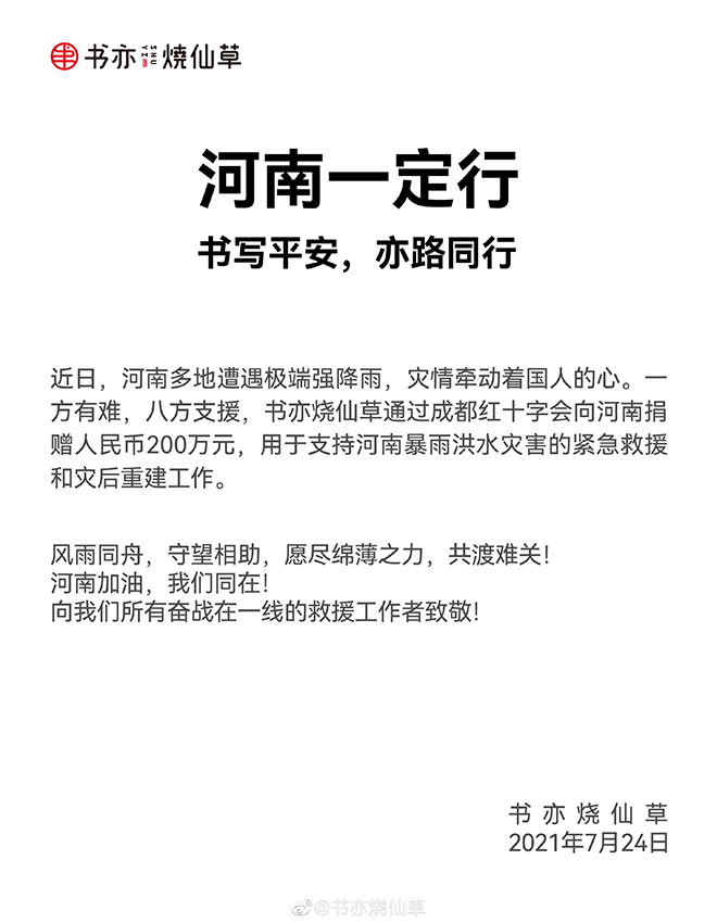 目前,书亦烧仙草通过成都红十字会,向郑州捐款200万元,用于支持河南暴雨洪水灾害的紧急救援和灾后重建工作。