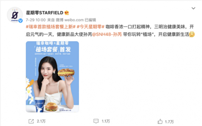 近日,本土头部植物肉品牌星期零正式官宣和瑞幸咖啡合作,推出瑞幸咖啡首款植物肉产品“青柠风味三明治”和“蛋香谷物三明治”。值得关注的是,星期零还将同时官宣自创立以来的第一位健康新品大使——SNH48艺人孙芮,并联合推出新品宣传片《今天星期零》。