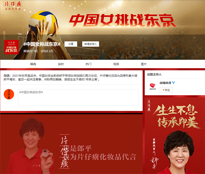 为了让更多人感受郎导和她的队伍们身上的女排精神,片仔癀化妆品还联合体育大V——新浪排球,共同发起#中国女排战东京#话题,并开设话题专属页,开辟品牌和用户的奥运助威阵地,最终收获了超22亿阅读量的不凡成绩。
