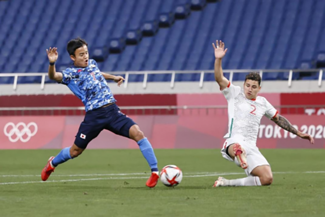 最后我们把目光聚集在日本国奥身上。面对状态火热,刚刚大胜法国的墨西哥队,日本国奥在比赛开场不久就为对手送上一盆冷水,而“泼冷水”的正是上一轮帮助球队取胜的久保健英!比赛开始第五分钟,日本在边路打出配合,堂安律斜插接球之后将球扫传至禁区点球点附近,由快速后插上的久保健英完成抢点射门。