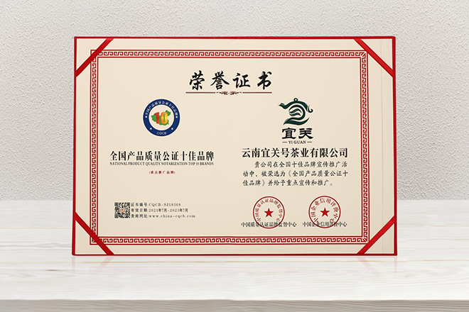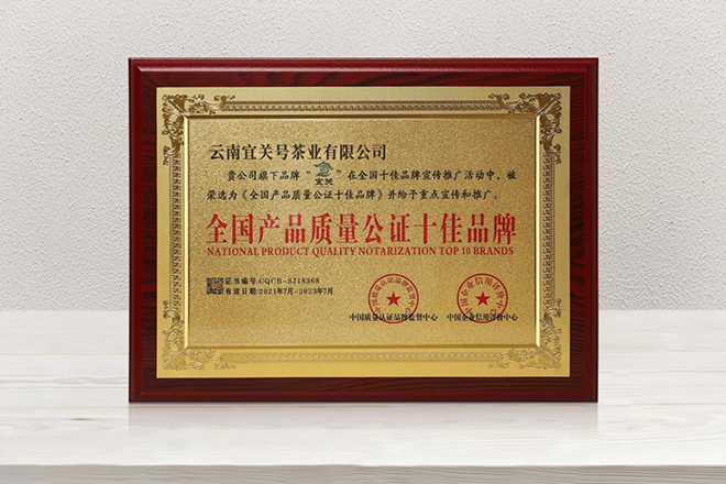 特大喜讯!宜关品牌一直以来始终坚持“宜年、关意”的品牌理念,矢志为用户提供云南原产地优质生态茶叶。如今在全国十佳品牌宣传推广活动中,以良好的品牌美誉度、有力的质量保证,在众多激烈的竞争品牌中脱颖而出,斩获《全国产品质量公证十佳品牌》荣誉!再一次彰显宜关品牌在茶叶市场中的品牌价值与地位!