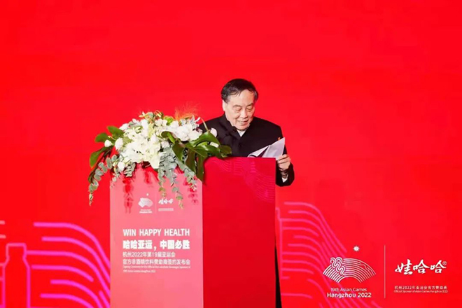 在发布会现场,宗庆后表示:这次发布会的主题是“哈哈亚运,中国必胜”,这和娃哈哈倡导的“Win Happy Health赢在健康快乐”的理念一脉相承,并与奥林匹克精神、亚运精神、全民运动理念相契合。“娃哈哈将会发挥好自身产供销一体化、品类全覆盖、品质超一流的行业优势,全力做好亚运服务工作,保障亚运全场景饮用水需求,讲好杭州故事,展现中国风采。”宗庆后说。