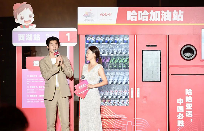 现场,为了贯彻杭州亚运会“绿色、智能、节俭、文明”的办赛理念,娃哈哈宣布:自9月起启动“哈哈加油站”项目,通过前期在杭州市内多处设置自贩回收机、亚运赛时在各比赛场馆设立能量水站,以及伴随亚运大事件节点举办巡游花车快闪活动等方式,践行“绿色健康”理念,推动全民运动风潮,为中国亚运喝彩助威。