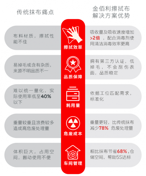 金佰利实验数据表明,车间将抹布更换为金佰利工业擦拭布后,同样的擦拭任务,使用金佰利擦拭布能够有效减少78%危废处理量,并节省68%的仓储空间。作为全球第一张工业擦拭布的发明者——拥有149年历史的金佰利,近年来一直坚持可持续发展2030战略,致力于为全球用户提供优质的工业擦拭解决方案,获得了商业合作伙伴们的高度认可。