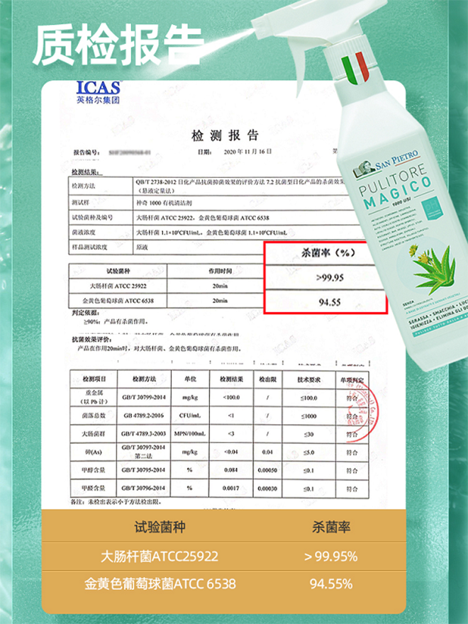 神奇1000纯植物提取,是天然的杀菌剂。权威机构检测报告显示,在试验菌种中,对金黄色葡萄球菌ATCC6538的杀菌率达到了94.55%,对大肠杆菌ATCC25922的杀菌率更是超过了99.95%!