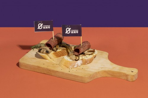 一款是针对中高端B端市场推出的星期零植物帕斯雀牛肉(plant-based pastrami)产品,对比市面上的同类真肉产品,星期零这款产品性价比高,价格可以做到接近真肉pastrami的一半,而且更健康。据了解,pastrami 其语意为烟熏肉,通常由牛肉制成。星期零植物帕斯雀牛肉是以非转基因大豆为主要原料,区别于此前植物肉的肉糜形态,采用整肉塑形的技术,制造出具有“一整块”牛肉纤维纹理的植物蛋白肉块,产品表面裹以黑椒等复合天然香辛料,色泽诱人,口感紧实。高蛋白,低脂肪,高膳食纤维,没有同类腌制肉类添加的亚硝酸盐,也不添加防腐剂,做到了0胆固醇、0反式脂肪酸。