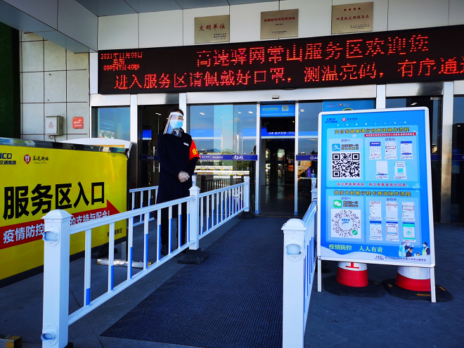 浙江交通集团常山服务区停车广场树立着一根根感应语音报闪器,当人群经过人行道时,报闪器自动感应,播放戴好口罩,准备两码等防疫提示、爱护环境、注意来往车辆等文明提示语,夜间还可亮起爆闪警示灯,提醒来往车辆注意行人;综合楼入口处,来往旅客向工作人员主动出示健康码、行程码,依次通过智能测温门;服务区后广场设有中高危地区专用停车区,方便省际防疫检查和消杀预防工作;服务区内部每日定时定人进行全面消毒,每日消毒不少于6次。司乘顾客楼女士说:“进入常山服务区就看到身穿防护服的工作人员在消毒,门店员工都会提醒我们带好口罩,让我感觉很安心。”为了保证员工以及司乘顾客的人身安全,避免出现交叉感染,服务区还设立了出口转轮匝、临时隔离点、第三卫生间等设施设备。