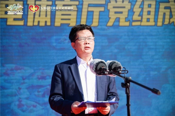 海南省旅游和文化广电体育厅全域旅游处处长朱悦旷宣读五指山红峡谷文化旅游区评定为国家AAAA级旅游景区的公告,并对景区评定成功表示热烈的祝贺。