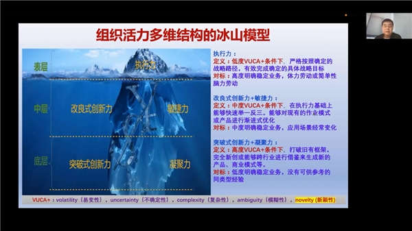 如何应对企业“墒”增带来的组织活力下降?李平教授构建了一个组织活力的冰山模型。模型由表层的执行力、中层的改良式创新能力以及底层的突破式创新能力组成。