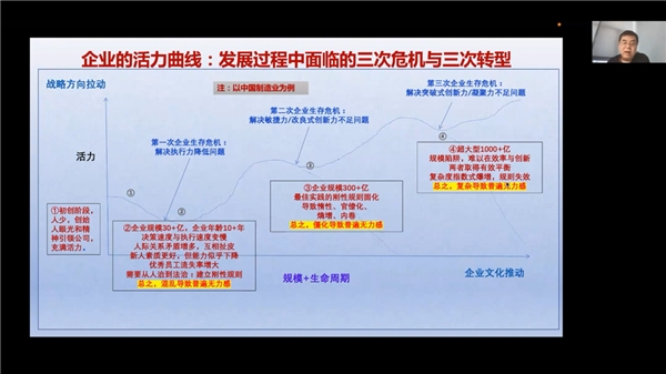 企业在发展过程中,一般会经历三次危机与转型。第一次企业生存危机,一般发生在企业规模达到30亿左右的水平时,企业需要解决执行力低下的问题,从人治走向法治。第二次生存危机,一般在企业规模达到300亿水平时,企业的最佳实践越来越固化,企业出现僵化,需要解决敏捷性和改良性不足的问题。当企业达到超大规模时,容易陷入规模陷阱,遇到第三次危机,难以在效率和创新二者中取得平衡,需要企业通过突破式创新突破困境。