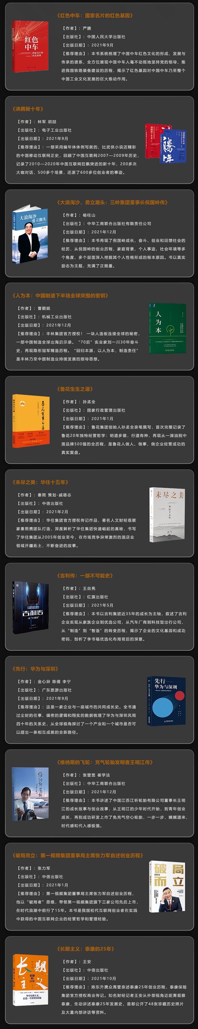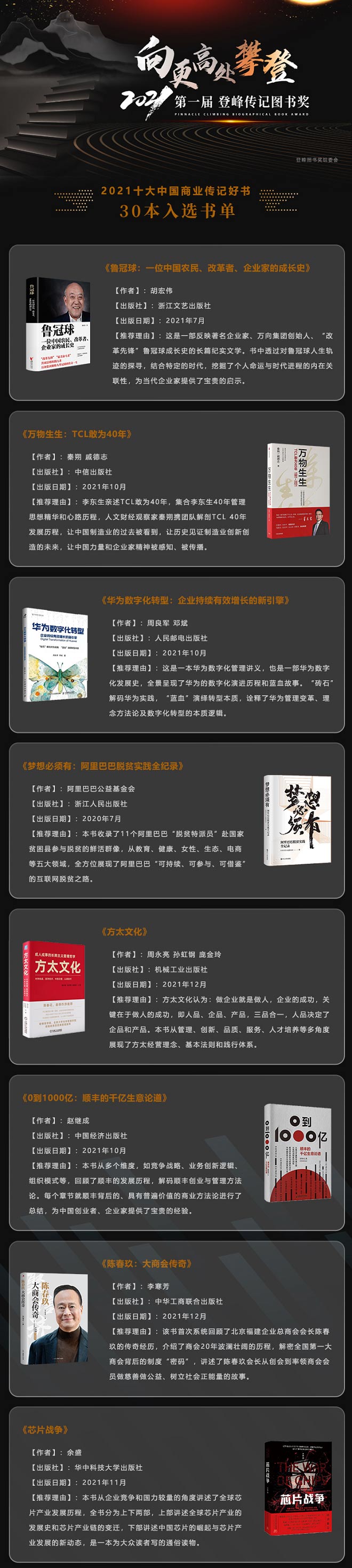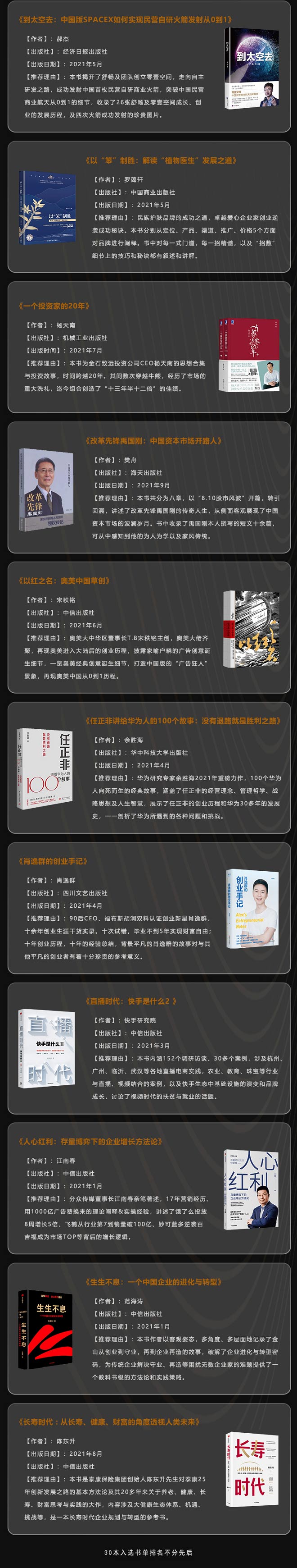 根据评选规则,2021年12月22日,组委会从几百部年度传记作品中,评选出30本“2021十大中国商业传记好书”初评书单。