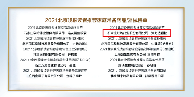 2021年12月29日,由《北京晚报》主办的“2021年度北京晚报读者推荐家庭常备药评选”结果揭晓,以岭药业生产的治疗2型糖尿病的创新专利中药津力达颗粒入选“北京晚报读者推荐家庭常备药品”榜单,获评北京晚报读者推荐的家庭常备降糖药。
