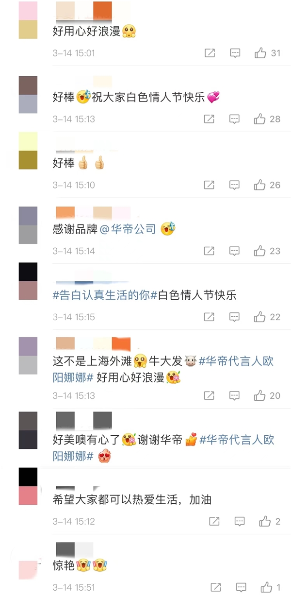 “今天不聊厨电,只想对你告白,认真的你,值得世间一切美好。华帝祝所有女生白 人节快乐”,伴随着大字交互的告白后,华帝品牌代言人欧阳娜娜手持鲜花向所有女生传递“越认真越缤纷”的态度。告白视频在3月14日一经官方发布,更是在网络上掀起一片热议,为白 人节添上一抹浪漫色彩: