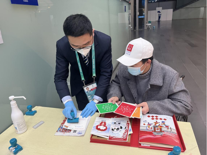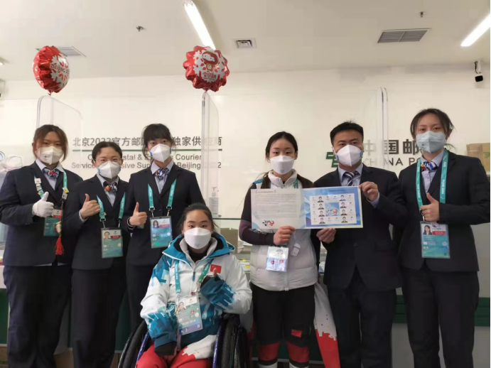 在国家体育场临时邮局,工作人员特别为冬残奥会开幕式的8名残健融合的持旗手提供了临时服务。在开幕式前几天,8名持旗手完成了一天紧张的排练后,想要选购一些纪念品,几经了解后得知邮政还在场馆内服务。当时,临时邮局正处在转换期,营业员了解情况后,很快挑选出具有代表性的冬奥邮品,向他们耐心地介绍邮品知识。为方便持旗手更加直观地了解邮品,营业员在介绍纪念封和邮折时,各准备两套邮品,分别用于正面和背面的展示,并协助翻阅邮册。“十几分钟的特别服务让他们很满意,连连向我们表示感谢。持旗手还拍摄了自己与冬奥会、冬残奥会吉祥物明信片的同框视频,传递着这份温暖和友爱。”临时邮局负责人刘荣伟激动地说。