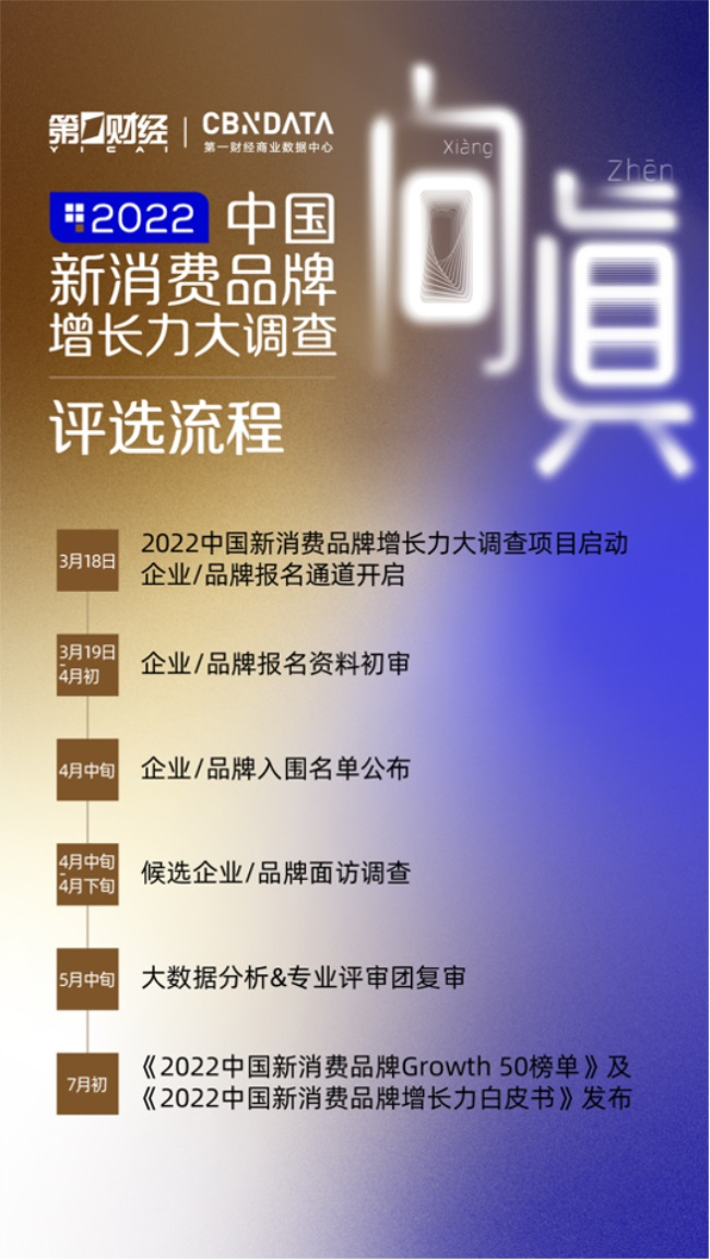 “向真·2022中国新消费品牌增长力大调查暨Growth 50榜单评选”项目将联合高等院校、投资机构、行业协会及专业媒体,面向社会征集中国企业及品牌报名,基于海量数据库定量、定型研究方法,以及深度走访调研等研究方式,从赛道、产品、用户、营销、经营、供应链、组织、社会责任八大维度展开调研及评选,探究品牌的真挑战、真需求、真实力,最终寻找在“向真之年”跨越周期的中国新消费品牌。