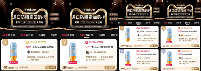 近年来,随着市场的不断教育,消费者对防晒的心智日益增强,防晒市场如春笋般蓬勃发展,各大品牌更是纷纷抢占赛道。据相关数据显示,截止至2022年1月,消费者对于防晒品类的关注度三年增幅高达68.11%,搜索量上涨超7倍以上。(数据来源《防晒行业趋势指南》)在竞争日趋激烈市场中,MISTINE一骑绝尘,防晒品类连续2年获得80%以上高速增长,明星单品小黄帽全渠道年度销量破千万瓶。在2022年开局战中就有了出色的表现,仅阿里平台3.8活动期间MISTINE小黄帽防晒一举获得天猫进口防晒霜回购榜、加购榜、热销榜、好评榜多榜TOP1。