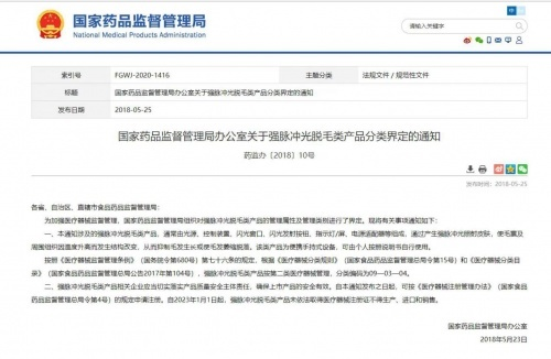 近年来,国家对医美领域的法规性要求持续加码,力图促使市场更加规范化!2018年4月,国家药监局发布关于强脉冲光脱毛类产品分类界定的通知,用于规范在医疗器械领域中脱毛仪类电子产品的分类界定。