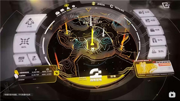 该图是实机演示中的一个界面,这应该就是终末地的主页界面了,同样包含干员、编队、档案、背包、采购、新闻等界面。玩家可以通过这个界面配置自己出发探索的队伍和干员等,也可以购买需要的战略资源。值得注意的是,这个界面上还有地图按钮,左下角还有一个显示着“北部岩漠深坑”、“大盐碱地”字样的信息面板。结合占据了整个画面主要部分的中间的巨大模拟地图,或许终末地的探索是以攻占地图上的一个个战略点的形式展开的,而玩家们要探索的地区就叫做“四号谷底”,前面我们提到过,在背景设定里,这里是一块非常危险复杂的区域。