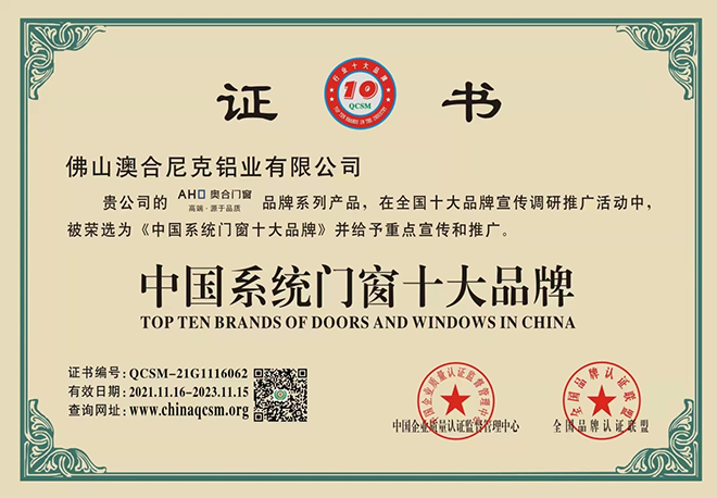 奥合系列产品自2021年入围十大品牌调研活动以来,被评委组多次实测产品性能,调查产品细节,最终被评委组选为系统门窗十大品牌予以宣传和推广!