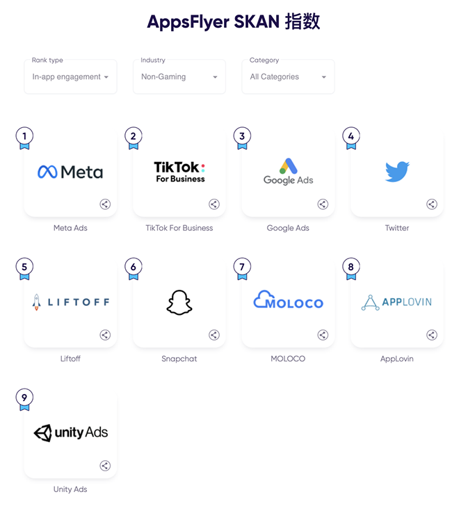 同样上榜的还有AppLovin、Unity Ads,两平台在其擅长的游戏领域表现良好,而社媒Twitter和Snapchat在非游戏方面的数据则更为出色。