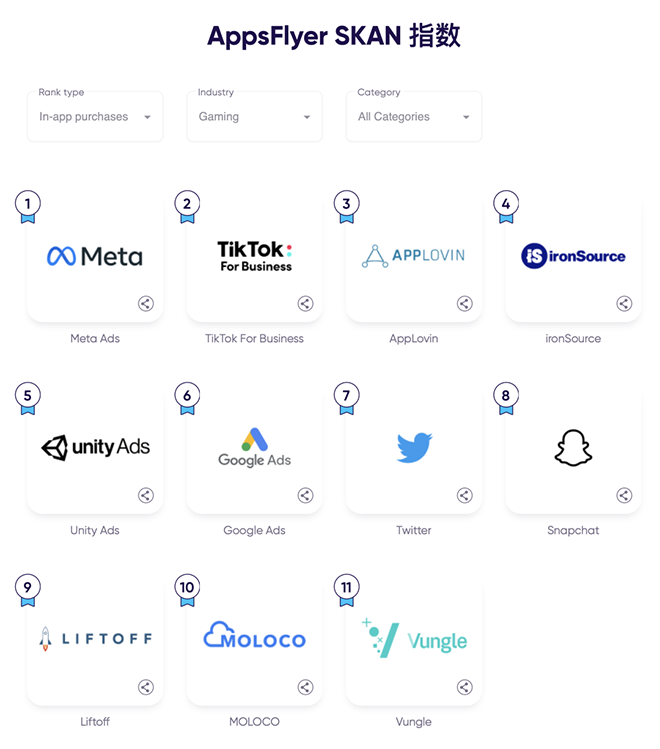 在上一个版本的报告中,Meta失去了在iOS蝉联多年的冠军宝座,但随着Meta的管理层在第一季度推出更多的电商工具,并开始投入资金进行自研追踪技术、转化率衡量技术研究,个性化推荐广告的负面影响得到了一定缓解。加之平台体量本身仍在,因此Meta得以重回SKAN指数榜单的榜首,获得非游戏 IAE、游戏与非游戏 IAP榜单的第一名。