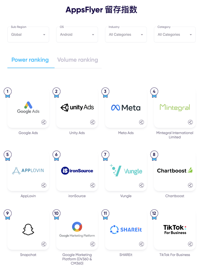 而留存榜中还有一个值得注意的中国出海平台,Mintegral。在双平台全品类留存排名中它都位列第四,是唯一跻身 iOS 及安卓双端榜单前4的中国平台。