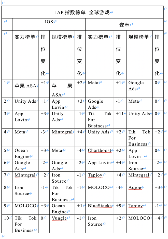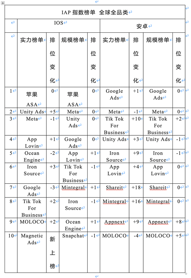 3、 IAP安卓侧全榜单浮动明显,Tik Tok For Business、Mintegral等平台增长突破10位。
