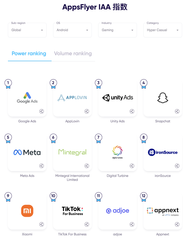在实力榜单上,Unity Ads上升了5位,ironSource上升了3位,在积极的并购扩张之下,这两者的转化能力都有了明显提升。