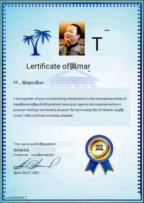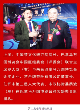 上图:中国茶文化研究院院长罗大友荣获—美国巴拿马太平洋(国际)万国博览会“终生评委”荣誉称号及证书