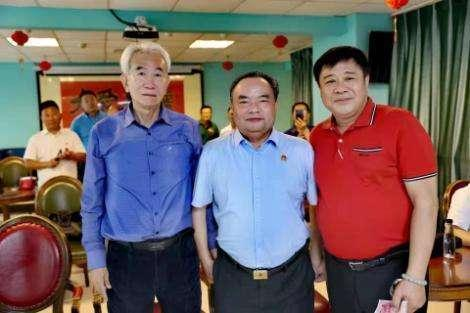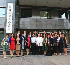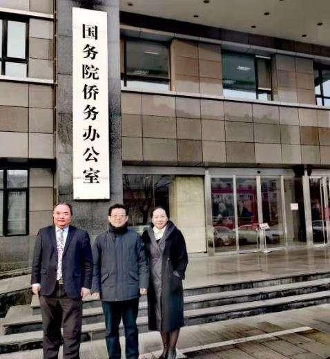 上图:国务院侨务办事务局局长许玉明(中)迎接中国茶文化研究院院长、世界华人联合会总会主席团主席罗大友(左)、世界华人联合会总会主席唐子懿(右)业务来访时在国务院侨务办门前合影留念。