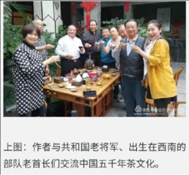 上图:中国茶文化研究院院长罗大友(中)与辽宁省军区司令员周汉江(右四)、沈阳武警总队司令员赵恒志(左二)等相约茶文化。