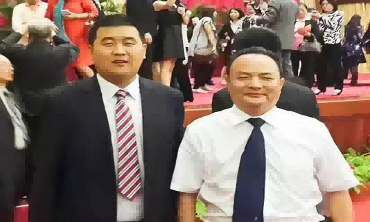《罗大友(右)在人民大会堂宴会厅与出席宴会的国务院侨办有关负责人合影》