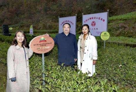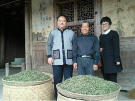 中国茶文化研究院院长罗大友(左)在福鼎白茶产区考察期间与手工制作白茶非物质文化遗产传承人梅相静(中)及地方有关领导(右)在梅氏制茶祖屋前合影。