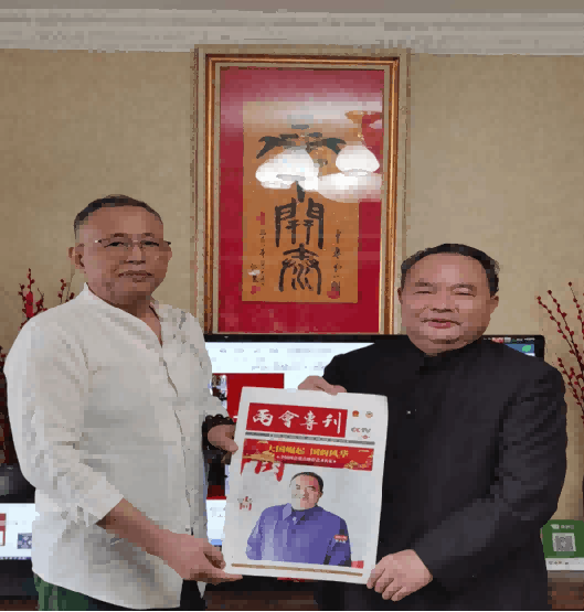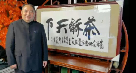 上图:中国茶文化研究院院长罗大友在开国夫人、老一辈无产阶级革命家习仲勋夫人齐心老人为茶文化题词牌匾前留影。