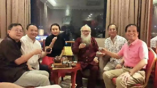 上图:中国茶文化研究院院长罗大友(左二)与道学家、香港“晓春拳”掌门人及《人民日报》社广东分社负责人等在长沙市橘子洲头切磋茶文化。