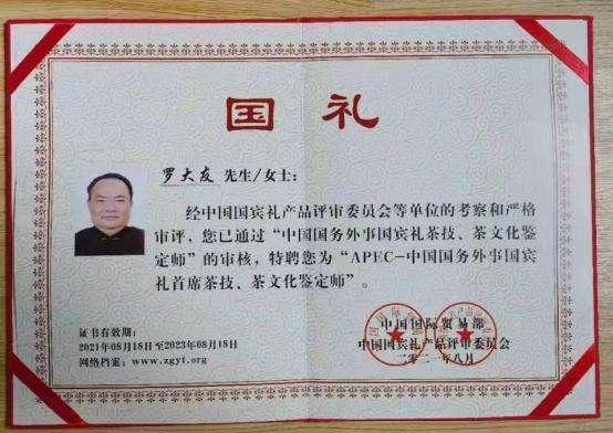 中国国际贸易部向中国茶文化研究院院长罗大友颁发的“国礼”首席鉴定师证书。